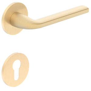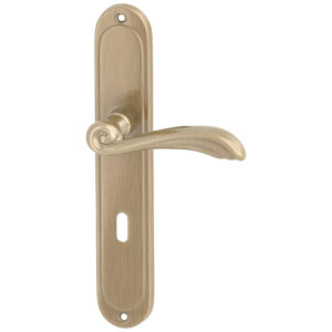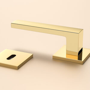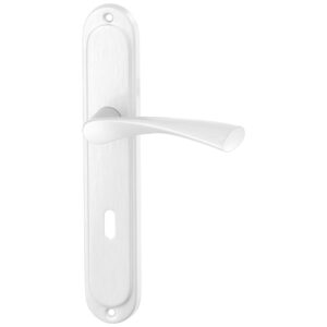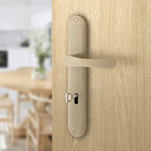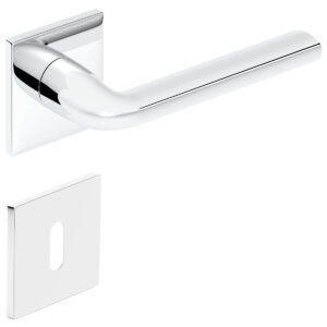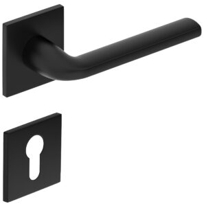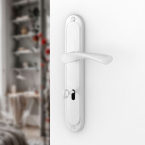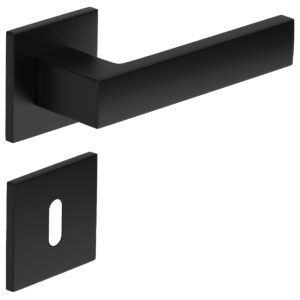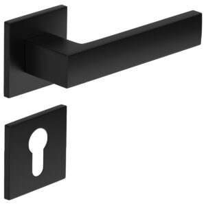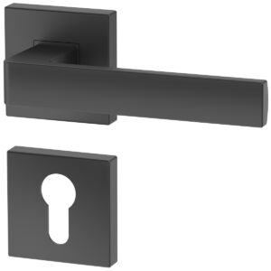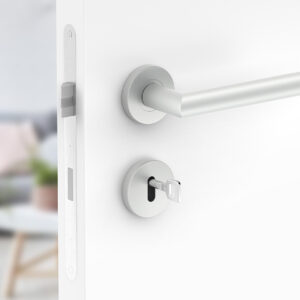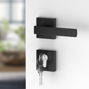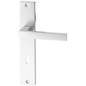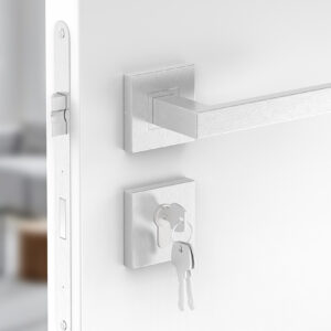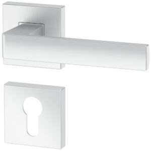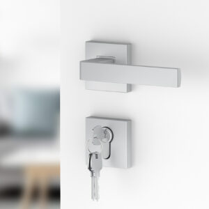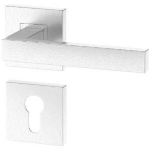 Der silberne, eckige Türbeschlag ERGO für Türen mit Zylinderschloss PZ; Türgriff; Türklinke