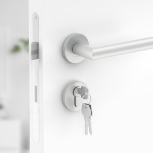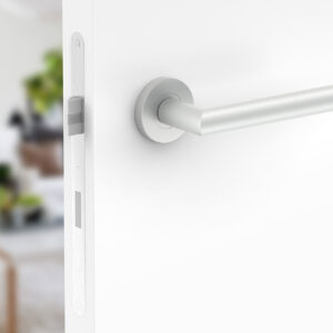 Der silberne, runde Türbeschlag UNO für Türen mit Zylinderschloss PZ; Türgriff; Türklinke