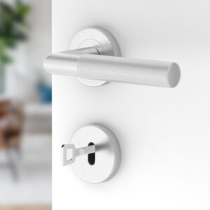 Der silberne, runde Türbeschlag UNO für Badtüren WC; Türgriff; Türklinke