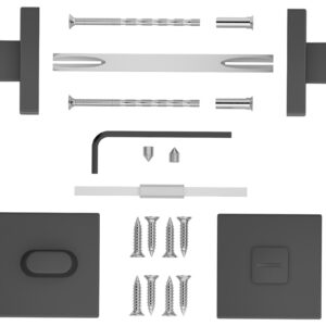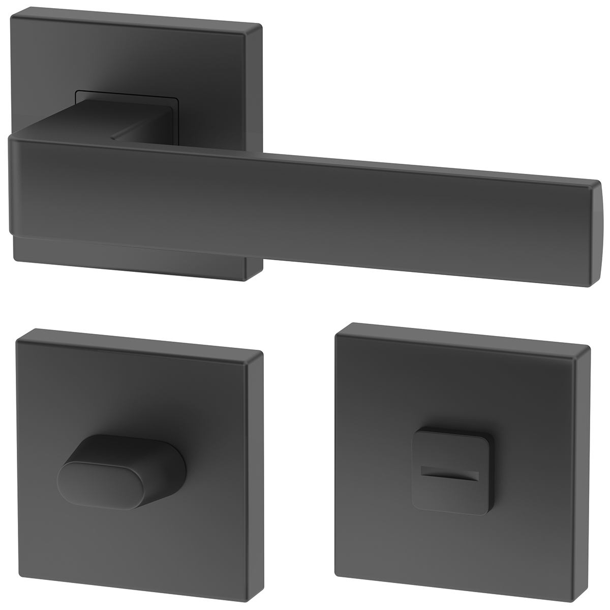 2 Türgriffe, 2 Drückerrosetten, 2 WC-rosetten, Inkl. Befestigungsmaterial.