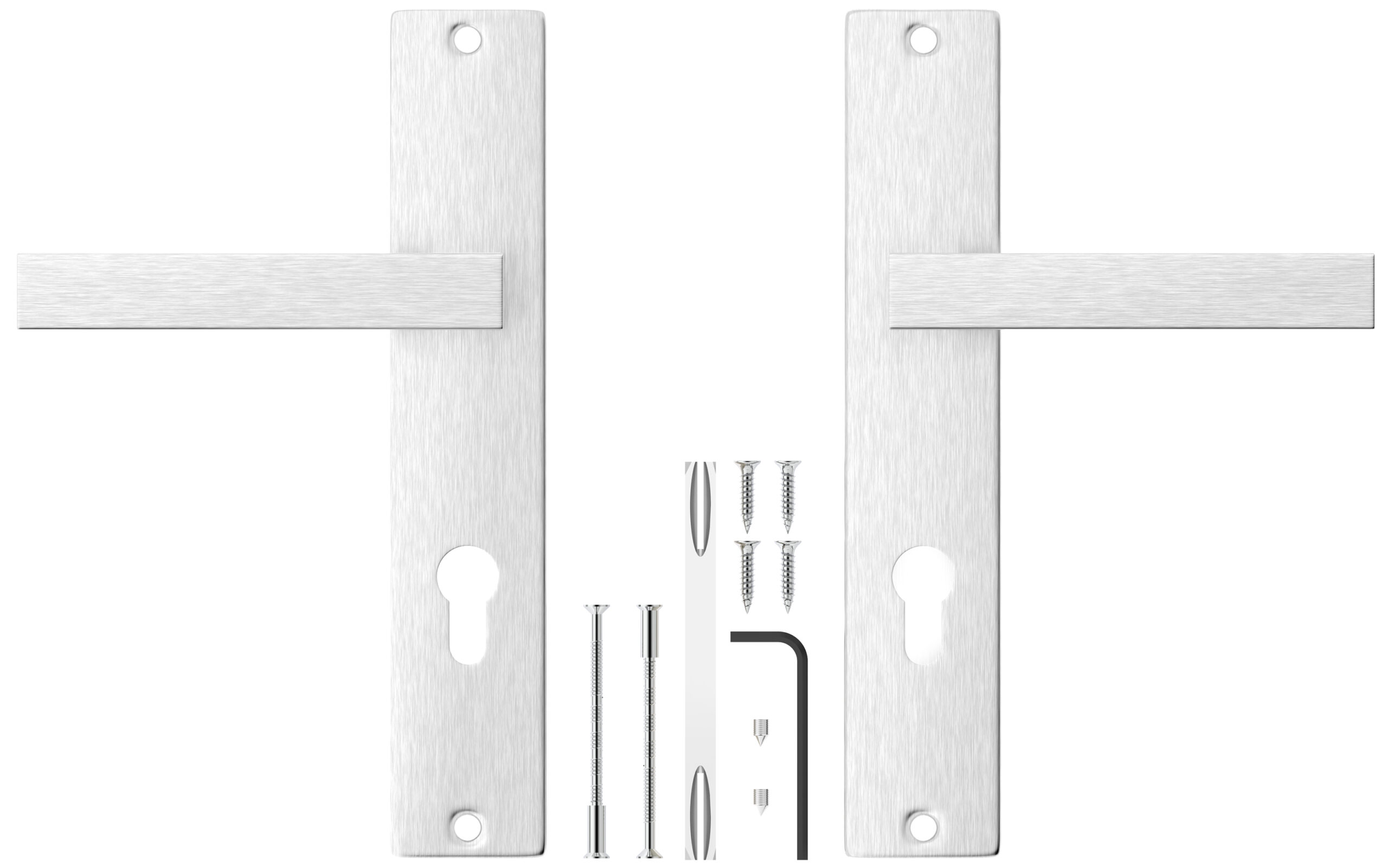 Das Türdrücker-Set besteht aus zwei PZ-Langschildgarnitur Griffen für eine Tür. Ist universal und passt zu Links- als auch Rechtsflügel. Beigelegt sind natürlich auch alle nötigen Montageteile.
