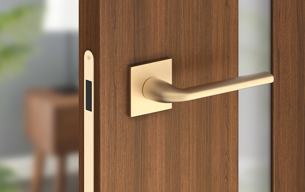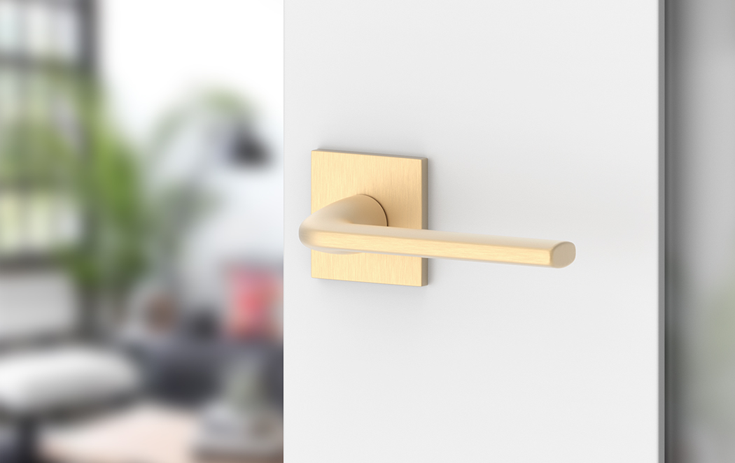 Premium Türbeschlag BELLA mit eckigen, schlanken Rosetten ohne Schlossrosette; messing satin; Türgriff; Türklinke