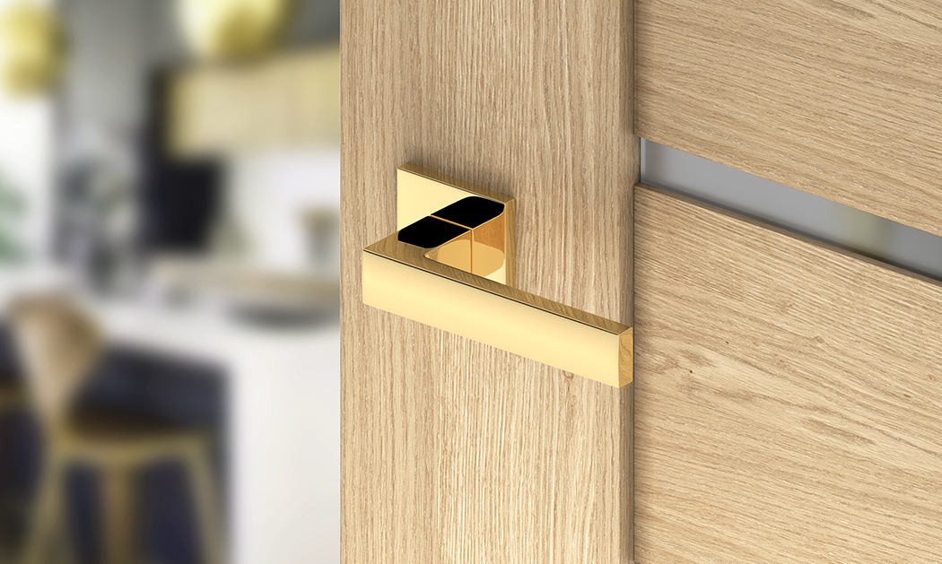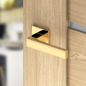 Premium Türbeschlag CUBE mit eckigen, schlanken Rosetten für Zimmertüren; messing poliert; Türgriff; Türklinke